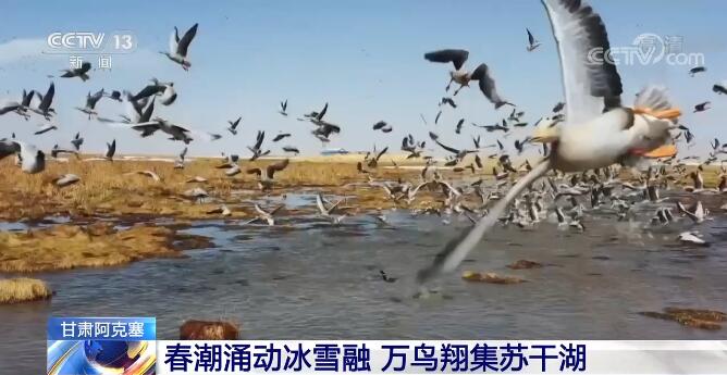 甘肃阿克塞:春潮涌动冰雪融 万鸟翔集苏干湖