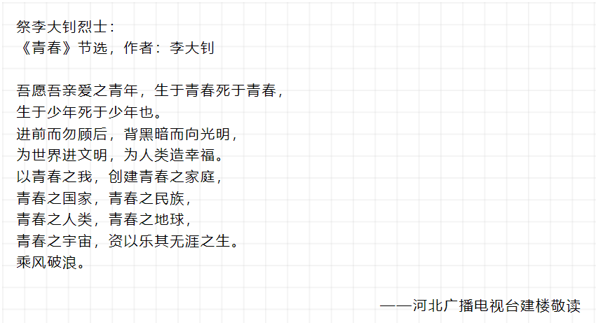 这篇以《青春》为题的文章发表在了1916年9月1日出版的《新青年》第二卷第一号,震动全国。当时,外国列强觊觎中国,严重民族危机之下,大批中国知识分子东渡日本,希望学习日本明治维新成果,探索中国救亡图存之路。1913年,李大钊在朋友的帮助下赴日本东京留学,考入早稻田大学政治学部。留学三年,“益感再造中国之不可缓”。