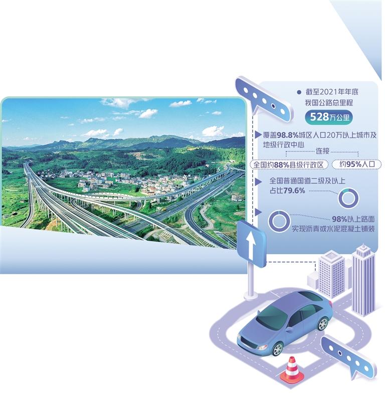 在上述规划指导下,国家公路网建设成效显著。数据显示,截至2021年年底,我国公路总里程达528万公里,路网规模位居世界前列,高速公路里程居世界第一位。以国家高速公路为主体的高速公路网络,覆盖了98.8%的城区人口20万以上城市及地级行政中心,连接了全国约88%的县级行政区和约95%的人口。普通国道基本覆盖县级及以上行政区和常年开通的边境口岸。国家高速公路中双向六车道及以上的路段占比达20.9%。全国普通国道二级及以上占比为79.6%。98%以上的路面实现了沥青或水泥混凝土铺装。