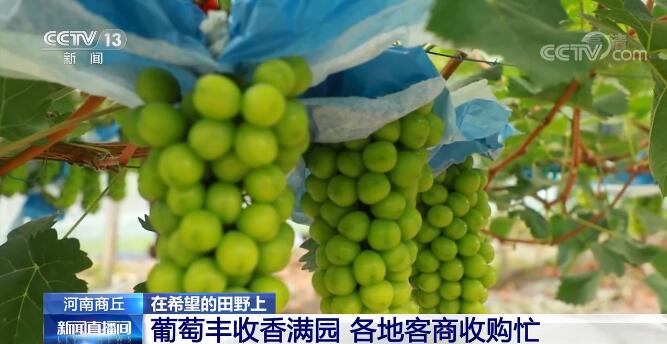 央视网消息:初秋八月,风吹稻浪、瓜果飘香,乡间田野到处都是一派丰收好景象。在河南商丘夏邑,上万亩的葡萄已经进入了成熟季。新鲜上市的葡萄不仅吸引了大量游客前来采摘,天南海北的客商更是直接跑到了地头前来采购。