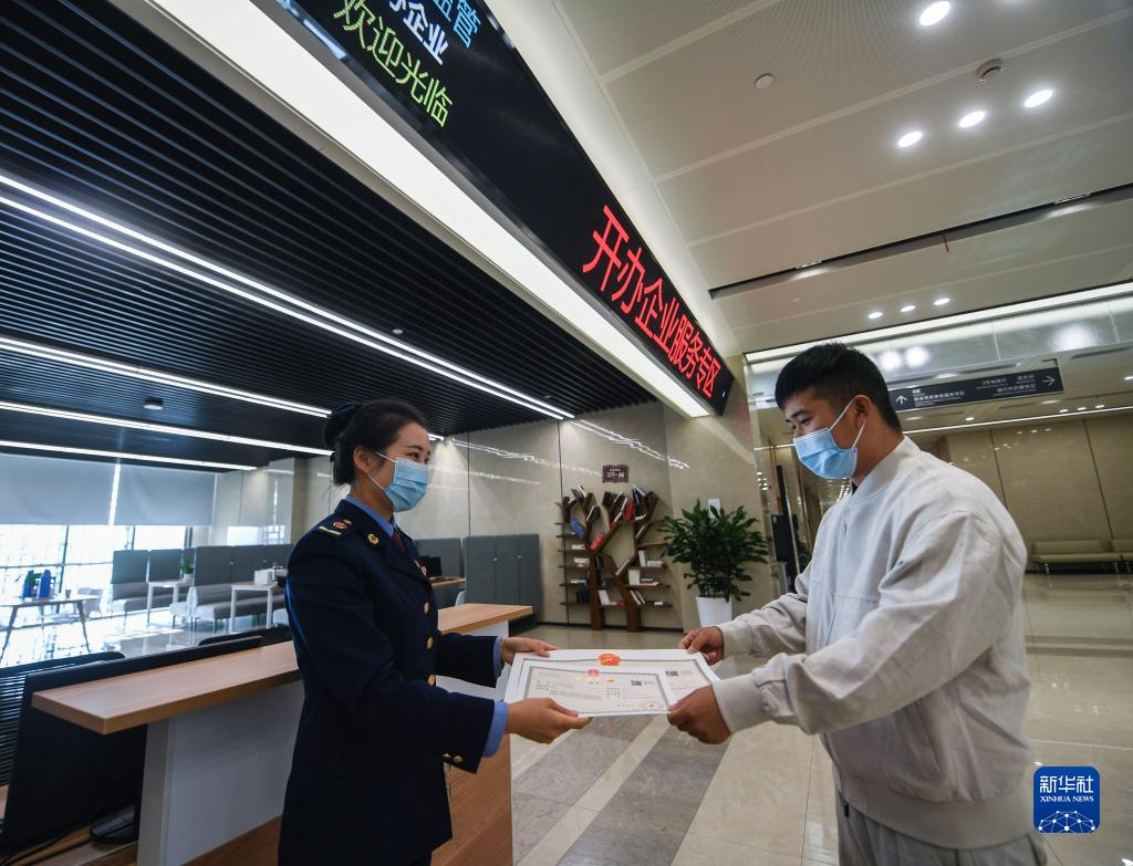 2020年11月10日,在浙江省杭州市临安区行政服务中心的开办企业服务专区,蒋先生(右)从工作人员手中接过营业执照。新华社记者 徐昱 摄