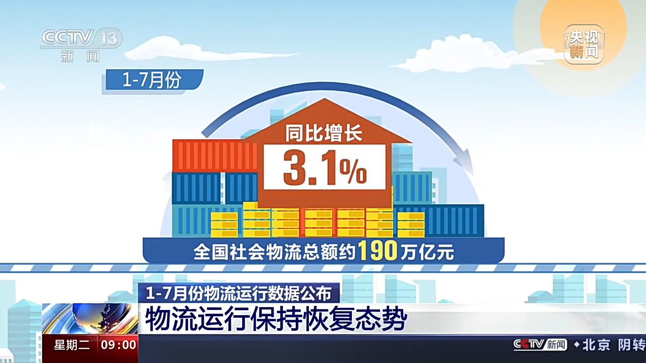 1—7月份,全国社会物流总额约190万亿元,同比增长3.1%。7月份同比增长3.3%,比6月小幅回落0.3个百分点。随着国家一系列稳经济大盘政策落地实施,物流需求结构呈现积极变化。