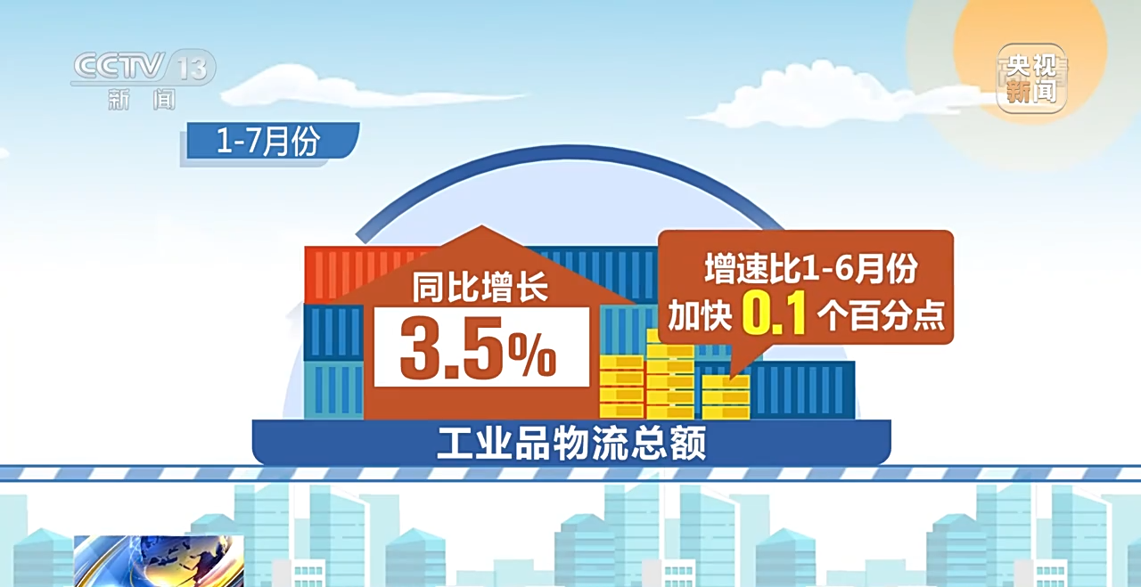 具体来看,1—7月份,工业品物流总额同比增长3.5%,增速比1—6月份加快0.1个百分点。其中,7月份增长3.8%,总体延续5月以来恢复态势。汽车制造等重点行业供应链恢复,畅通稳定,光伏产业等高技术制造的物流需求增速持续保持高速增长,继续发挥引领带动作用。