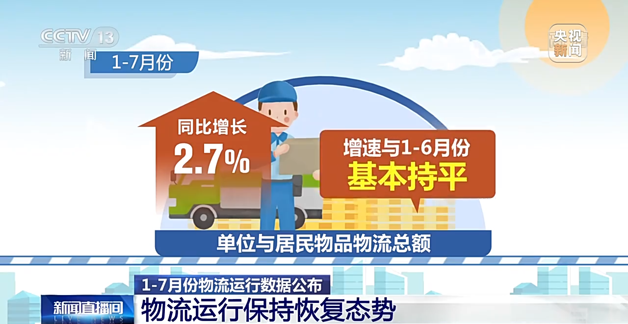 民生消费物流需求保持平稳增长。1—7月份,单位与居民物品物流总额同比增长2.7%,增速与1—6月份基本持平。