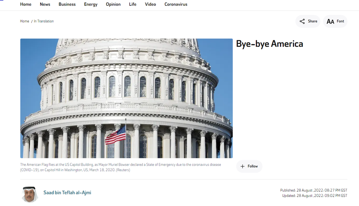 中国日报网8月30日电 (党超峰)沙特阿拉比亚电视台网站8月28日刊发科威特前新闻部长Saad bin Teflah al-Ajmi的文章《再见了,美国》。他在文中批评当下的美国乱象,称其令人难以忍受。文章摘编如下: