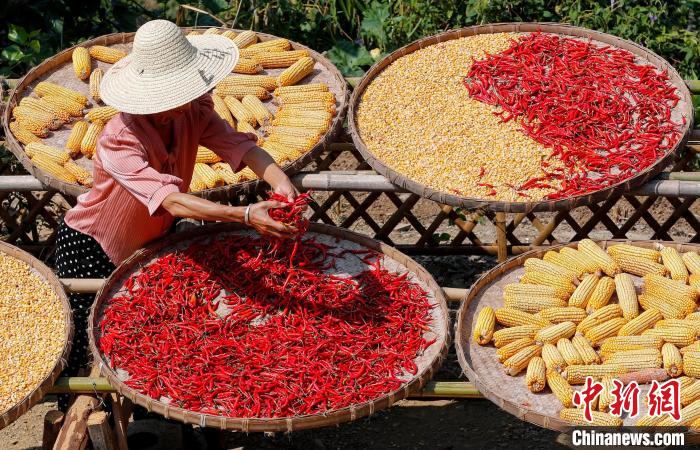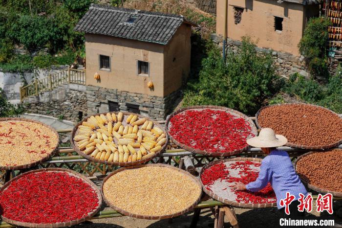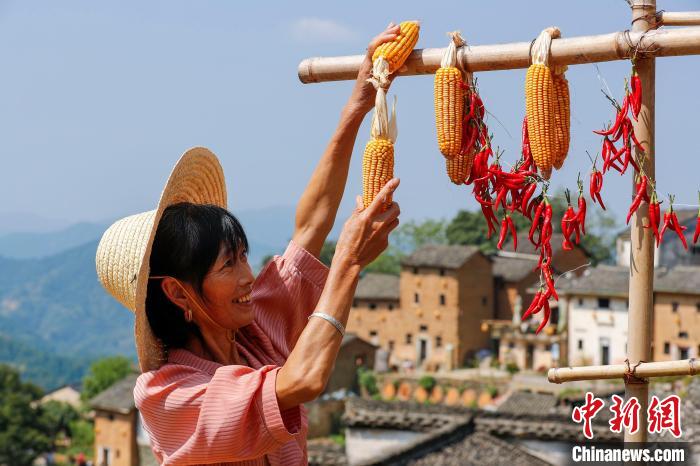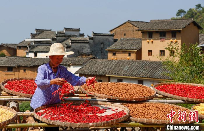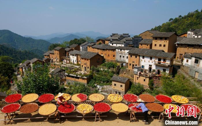 9月19日,在安徽省黄山市歙县阳产村,村民正在土楼前晾晒农作物。仲秋时节,在安徽省黄山市歙县深渡镇阳产村,村民利用晴好天气将收获归仓的红辣椒、玉米、山核桃等农作物晾晒在土楼前,五彩斑斓的农作物与鳞萃比栉的土楼交相辉映,描绘出一幅山村土楼丰收“晒秋”图。