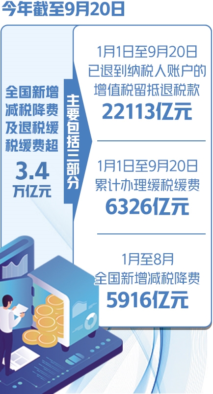 本报北京9月29日讯(记者曾金华)国家税务总局最新数据显示,今年落实新的组合式税费支持政策扎实推进,截至9月20日,全国新增减税降费及退税缓税缓费超3.4万亿元,有力缓解了企业资金压力,减轻了企业税费负担。