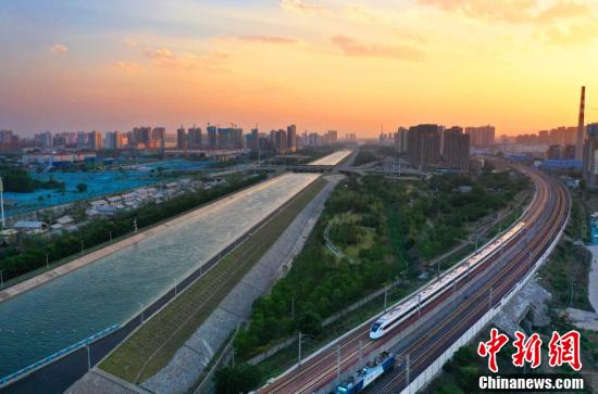 世纪工程——南水北调的中线自丹江口水库一泓清水永续北送。那么,自然流淌的南水北调中线为何在河南省焦作市形成“Z”字弯,绕道穿城而过?29日,中新网记者随“奇迹中国 天河筑梦”——南水北调工程网上主题宣传活动采访团走进南水北调中线焦作段总干渠了解到,原来是南水北调中线水源地的丹江口大坝加高了14.6米,中线工程全线高差控制在98.8米,实现全程自流,而焦作地势为西高东低、北高南低,北上的“南水”在焦作境内需要拐弯自西向东流至焦作市东部,再拐弯北上。图为南水北调中线在焦作拐弯入城。 焦作市南水北调建设发展公司 供图 (中国互联网发展基金会中国正能量网络传播专项基金资助支持)