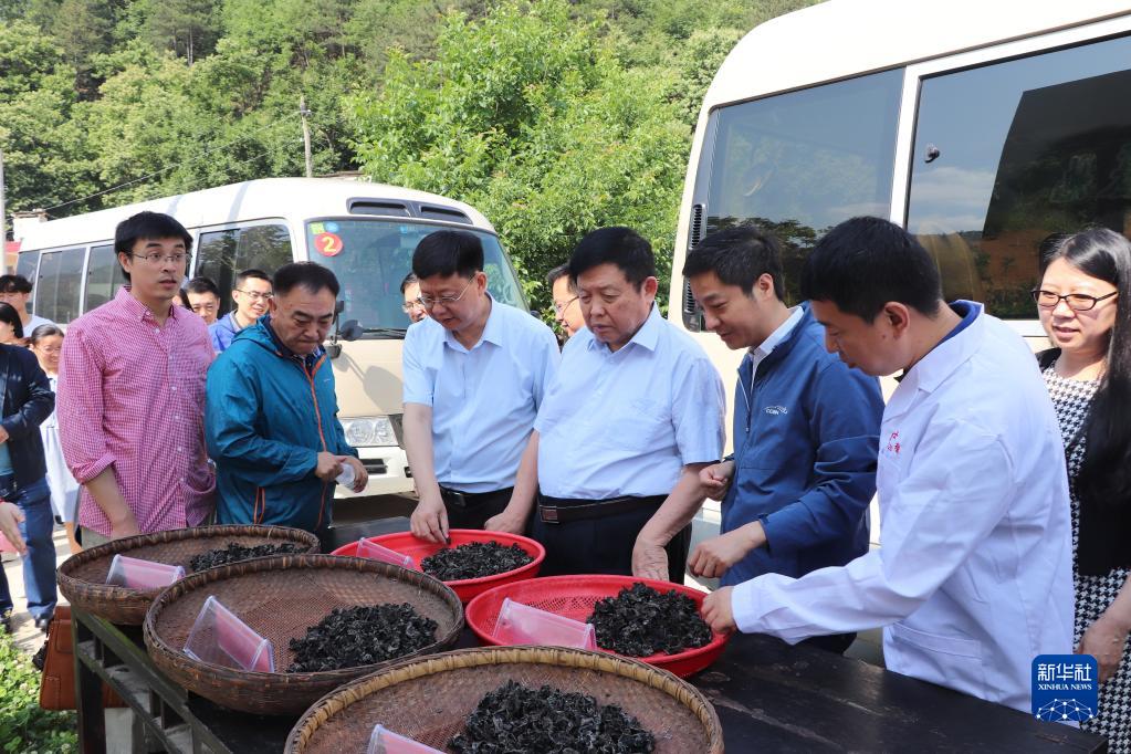 李玉在陕西省柞水县调研当地黑木耳生产和品种选育情况(资料照片)。 新华社发