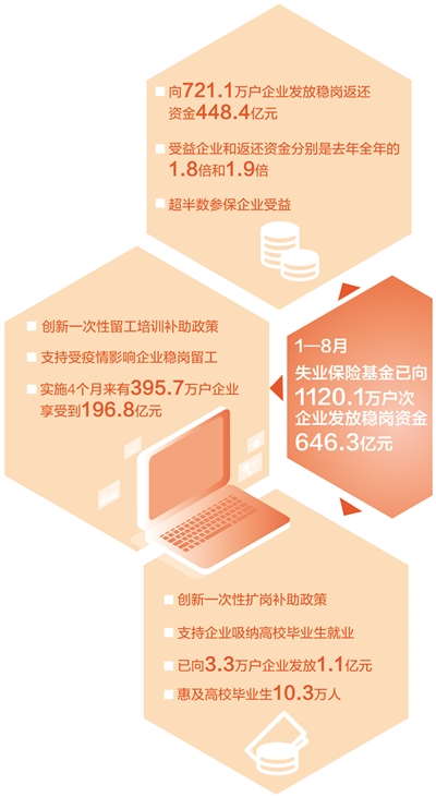 “返”,将中小微企业的失业保险稳岗返还比例由60%最高提至90%,大企业由30%提至50%。1至8月,各地向721.1万户企业发放稳岗返还资金448.4亿元,受益企业和返还资金分别是去年全年的1.8倍和1.9倍,超半数参保企业受益。