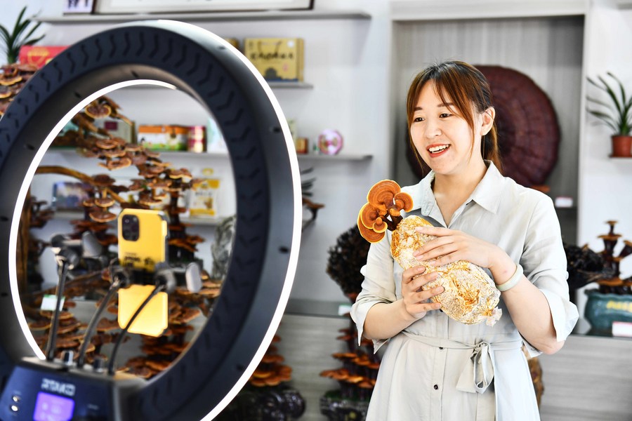 A live-streamer promotes lingzhi mushrooms in Guanxian County of Liaocheng City in east China's Shandong Province, July 9, 2022. (Xinhua/Guo Xulei)