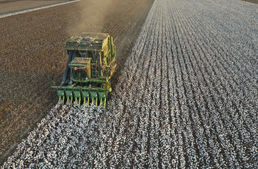 A cotton picker works in a field in northwest China's Xinjiang Uygur Autonomous Region, Oct. 13, 2022. The cotton harvest season started in October in Xinjiang, the largest cotton-growing area in China. (Photo by Wang Yawen/Xinhua)