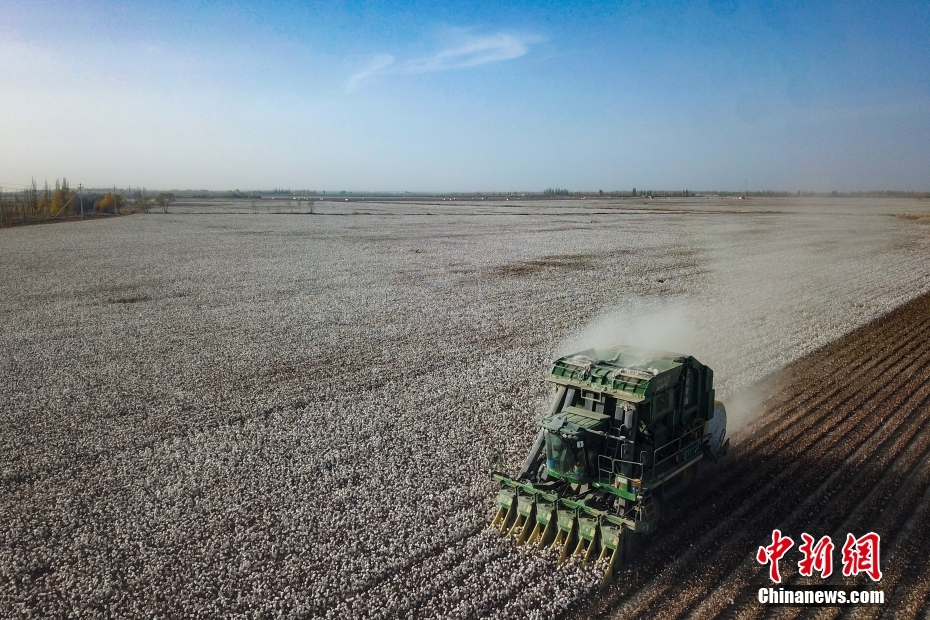 近日,记者走进阿克苏地区沙雅县红旗镇喀什托格拉克村的一处棉田,两台国产采棉机正在采收棉花,一派丰收景象。沙雅县约190万亩棉花喜迎丰收,万顷棉海里采棉机高效作业,预计11月中旬全部采收完毕。