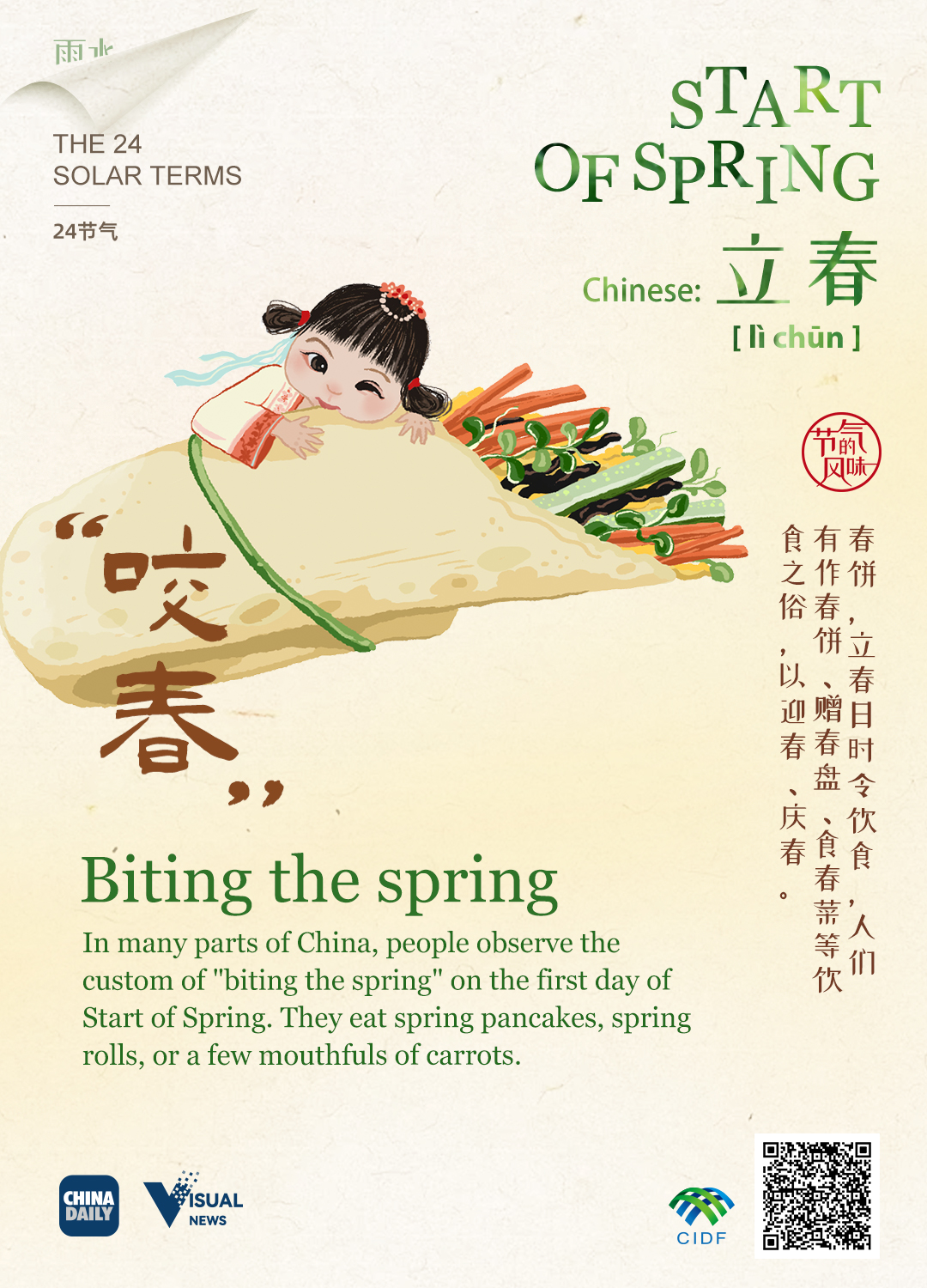 In many parts of China, people observe the custom of "biting the spring" on the first day of Start of Spring. They eat spring pancakes, spring rolls, or a few mouthfuls of carrots.