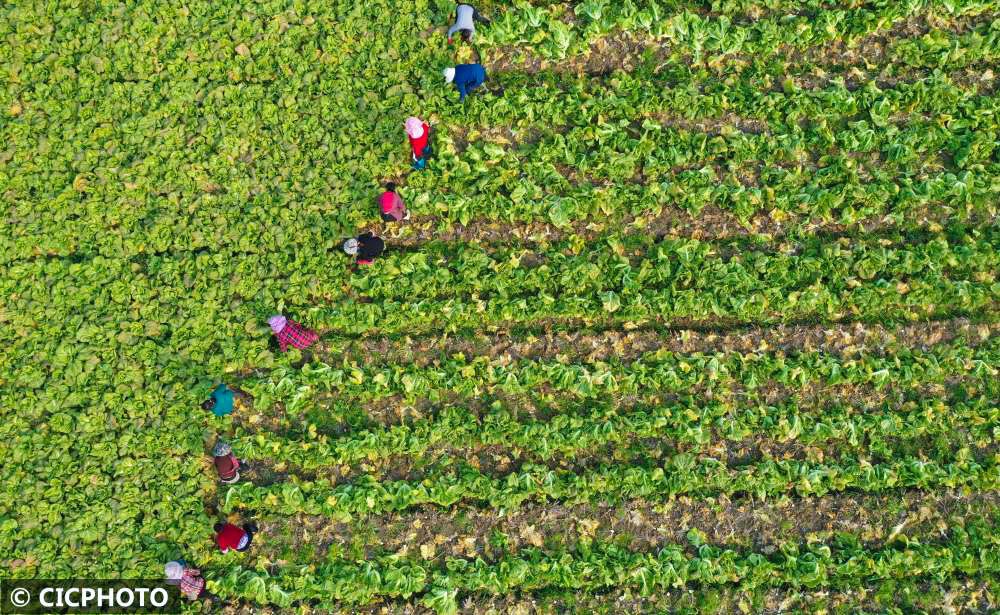 ↑2023年2月2日,在四川省眉山市东坡区太和镇四维村,农民在田间收割蔬菜。CICPHOTO/姚永亮 摄