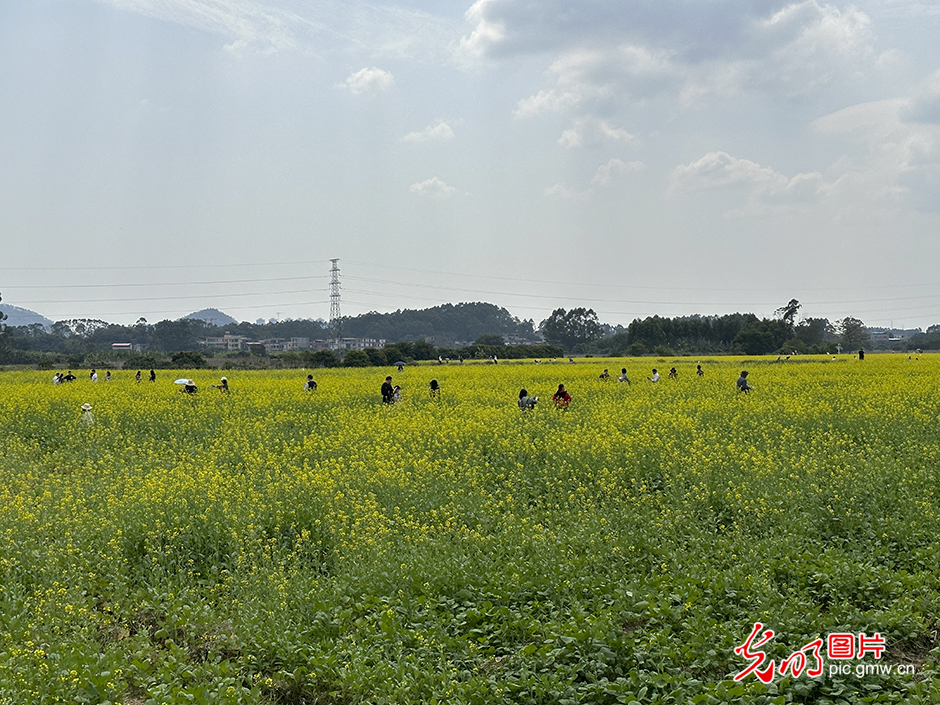 2023年2月19日,广东省广州市增城区,游客在丝苗米稻田公园的油菜花地里打卡拍照。(光明网记者 赵金悦摄/光明图片)