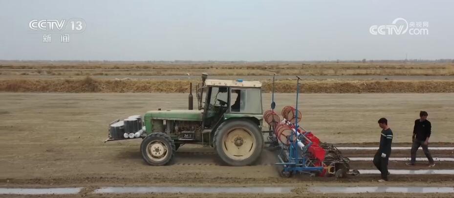 在巴州尉犁县巴西买里村,村民正在用自动驾驶北斗导航播种机播种棉花。和往年不同的是,棉花地今年首次使用了厚膜播种技术,在地表覆盖厚膜,可以更加有效地提高地温,减少水分蒸发。