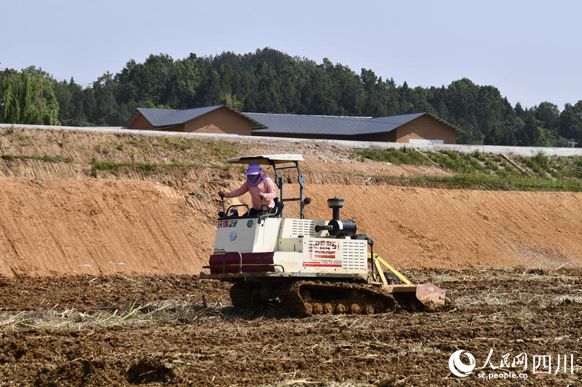 在巴中市通江县广纳镇构花坪村高标准农田内,村民正操作着农用翻地机在劳作。人民网记者 王洪江摄