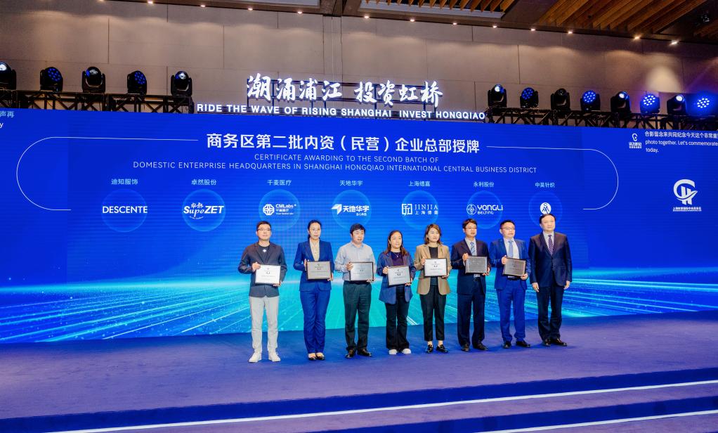 5月25日,“潮涌浦江投资虹桥”2023虹桥国际中央商务区投资促进大会现场,7家新认定的内资(民营)企业总部集体授牌。新华社记者周蕊 摄