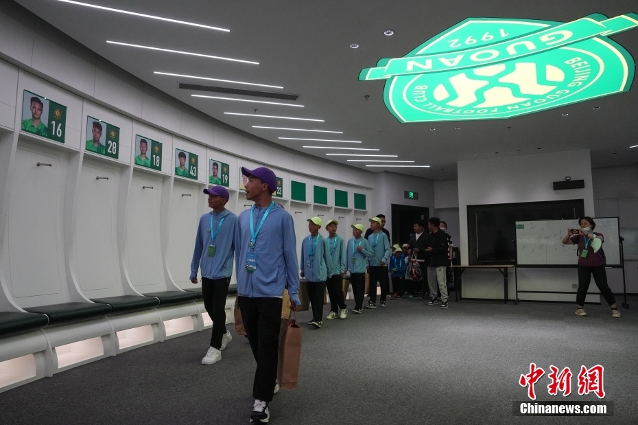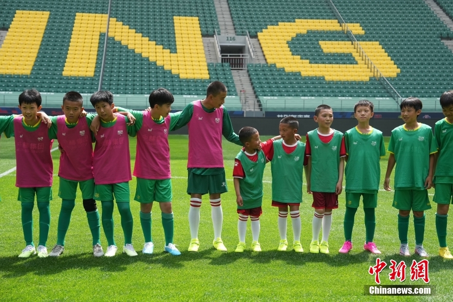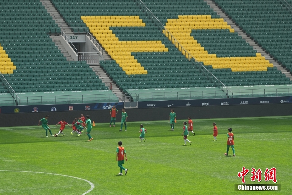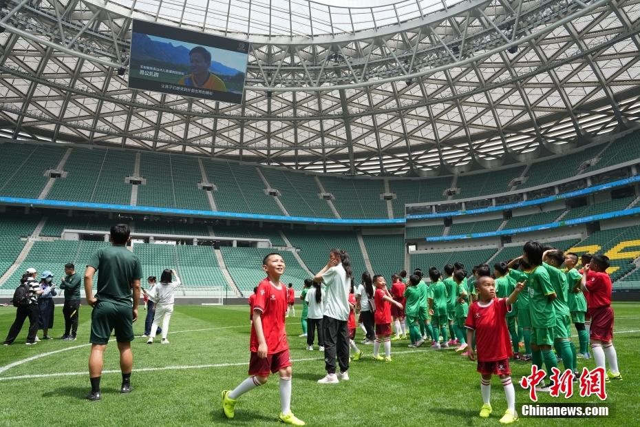 北京国安小球员和青海玉树的藏族少年们一起走进球场。