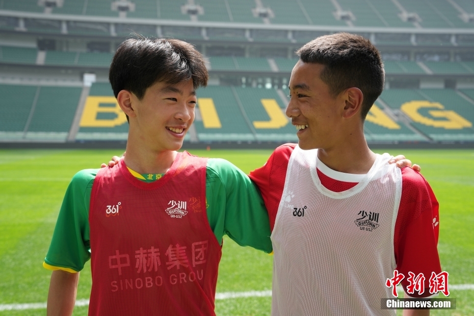 生日在同一天的国安小球员赵云(左)和青海玉树的扎巴江才(右)在场边微笑。