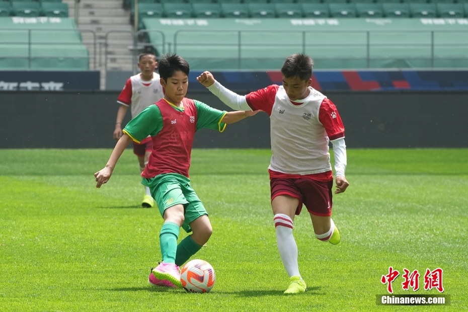 来自玉树的足球少年和北京国安的小球员一起训练。