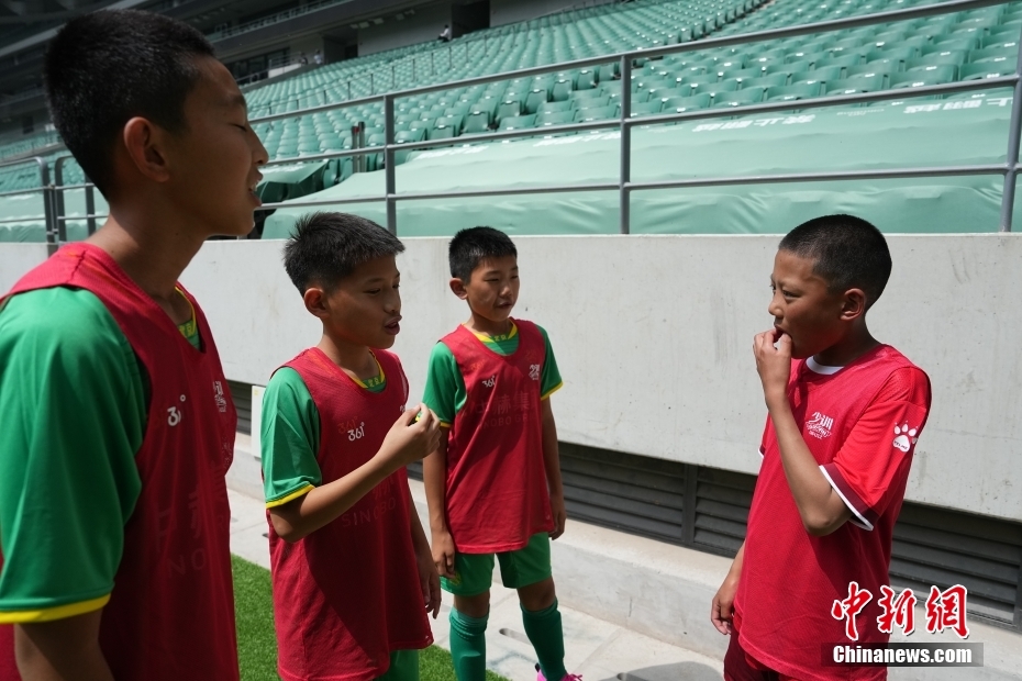 6月1日,一场别开生面的足球赛在北京工人体育场中进行。参赛双方是来自青海玉树的40位藏族青少年和北京国安2010年龄段(U12梯队)的30名小球员。这也是新工体首次迎来藏族儿童足球队。图为北京国安小球员陈小北和7岁的俄金仁增在一起观看场内播放的纪录片。