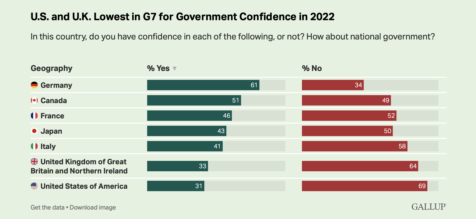 据《国会山报》当地时间7月3日报道,根据盖洛普最新发布的一项针对七国集团政府信心指数的民意调查显示,美国和英国获得的信心指数最低。