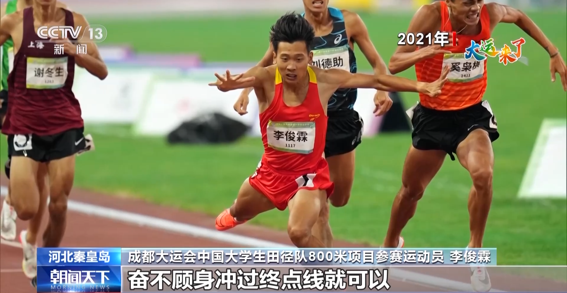 成都大运会中国大学生田径队800米项目参赛运动员 李俊霖:那不勒斯的大运会进入了决赛,我觉得还算是比较满意。我也想在最后一次(大运会)比赛赛场上,拿到自己一个满意的成绩。希望能让大家看到我们的青春力量,展现出我们的活力。