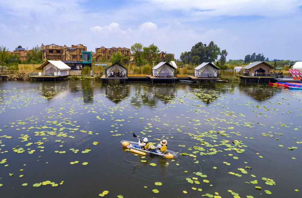4月30日,游人在滇池南岸晋宁区上蒜镇小渔村划船休闲。(图源:新华社)