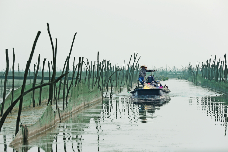 岸边的滩涂全部被开发成鱼塘、蟹塘之后,人们又逐渐向内湖“进军”,开始“创造性”地在内湖筑坝围网养鱼、养蟹。
