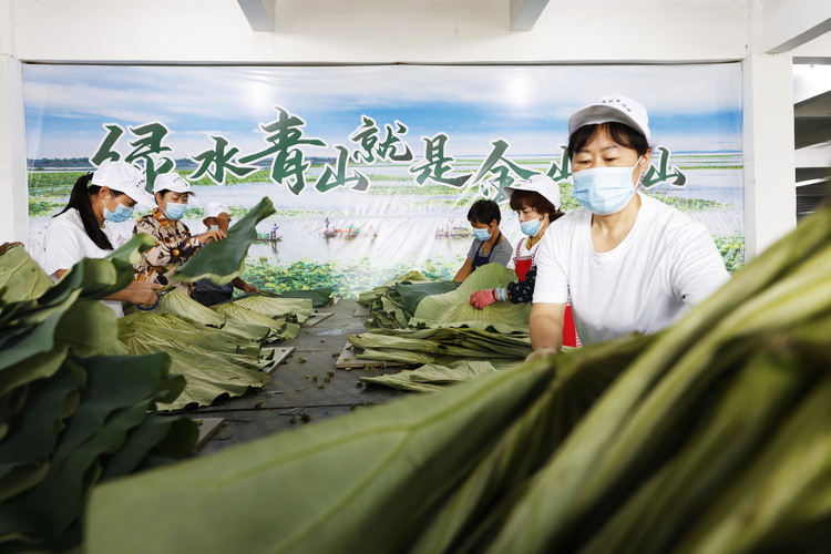 △泗洪县半城镇渔民在“水上牧场”采集荷叶