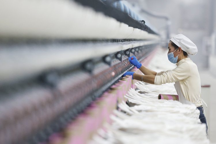 △泗洪县龙集镇勒东村上岸渔民在村里纺织企业车间务工