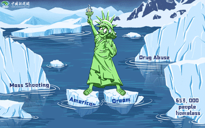 种种社会问题加剧社会悲观情绪蔓延,社会治理失调凸显“美国梦”行不再光鲜的事实。据美国广播公司(ABC News)本月中旬报道,该公司联合益普索开展了一项关于“美国梦”的民调。与2010年首次开展此项民调时,50%的受访民众相信“美国梦”存在的事实相比,最新民调中,仅有27%的人认为“美国梦”依然存在。“噩梦”还是“幻梦”?以激励个人获得成功的“美国梦”恐将为社会困局的毒藤所缠绕,“自由女神火炬”指引下的美国梦成为一个个“美国噩梦”。(彭大伟 孟湘君 谷丽萍 陈善坤 薛凌桥)