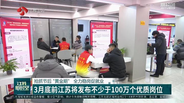 江苏省人社厅劳动就业管理中心主任夏文哲介绍,在线下,打造129个专业化公共人力资源市场、50个规范化零工市场、300个“家门口”就业工作站服务矩阵;在线上,主推“就在江苏”智慧就业云平台服务品牌,开设全国首个省级抖音视频号。到3月底,全省计划筹集发布不少于100万个优质就业岗位信息,全力以赴促匹配、稳岗位、保权益,奋力夺取就业开门红。
