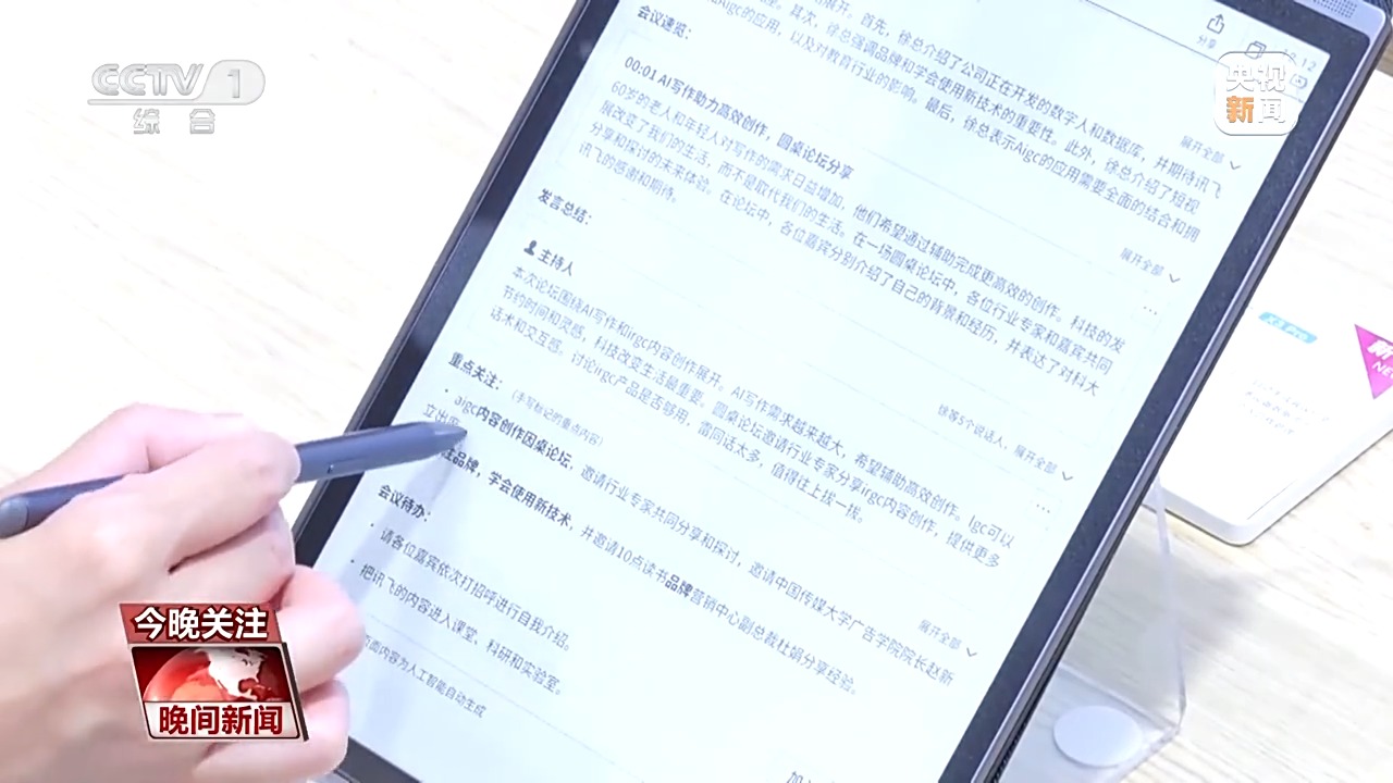 人工智能让我们的工作变得更高效,大模型可以说是近年来最火的一个词儿了,在展会现场,展示了一款搭载了大模型的办公本。它不仅“能听会记”,还能“思考和分析”,我们来试一下。这里显示的是工作人员之前的一次会议纪要,有很多人发言。我们试用下AI助手功能,选择“语篇规整”,可以看到,几秒钟就转化成一个更规整的文本,对比能看出是把语气词和重复的话都删掉了。再试一下生成结论的功能,可以看到很快就能把多人发言做一个总结,还能提炼出大家的要点。