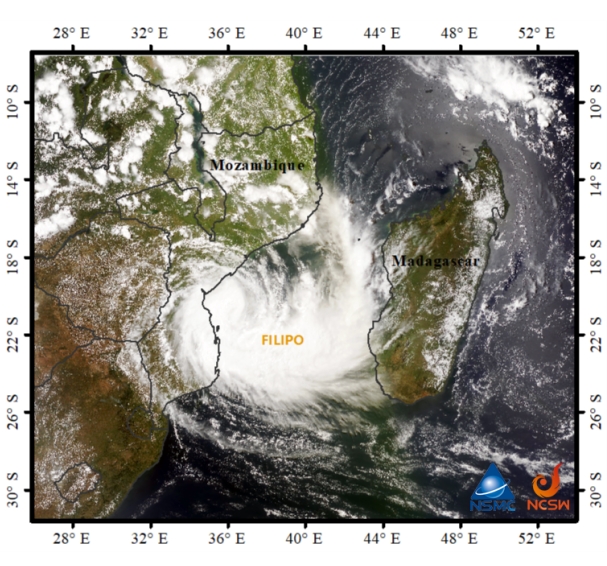 The FY-3D meteorological satellite true-color monitoring image shows that the main body of the severe tropical storm Filippo was located in the Mozambique Channel at 20:35 on March 11 (Beijing Time), and its peripheral cloud system has begun to affect the central and eastern areas of Mozambique. [Photo provided by China Meteorological Administration]