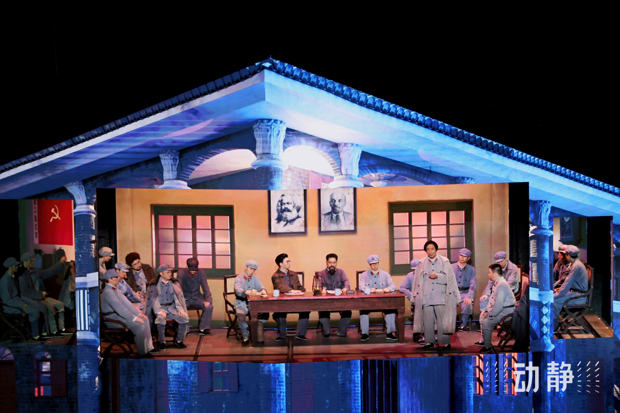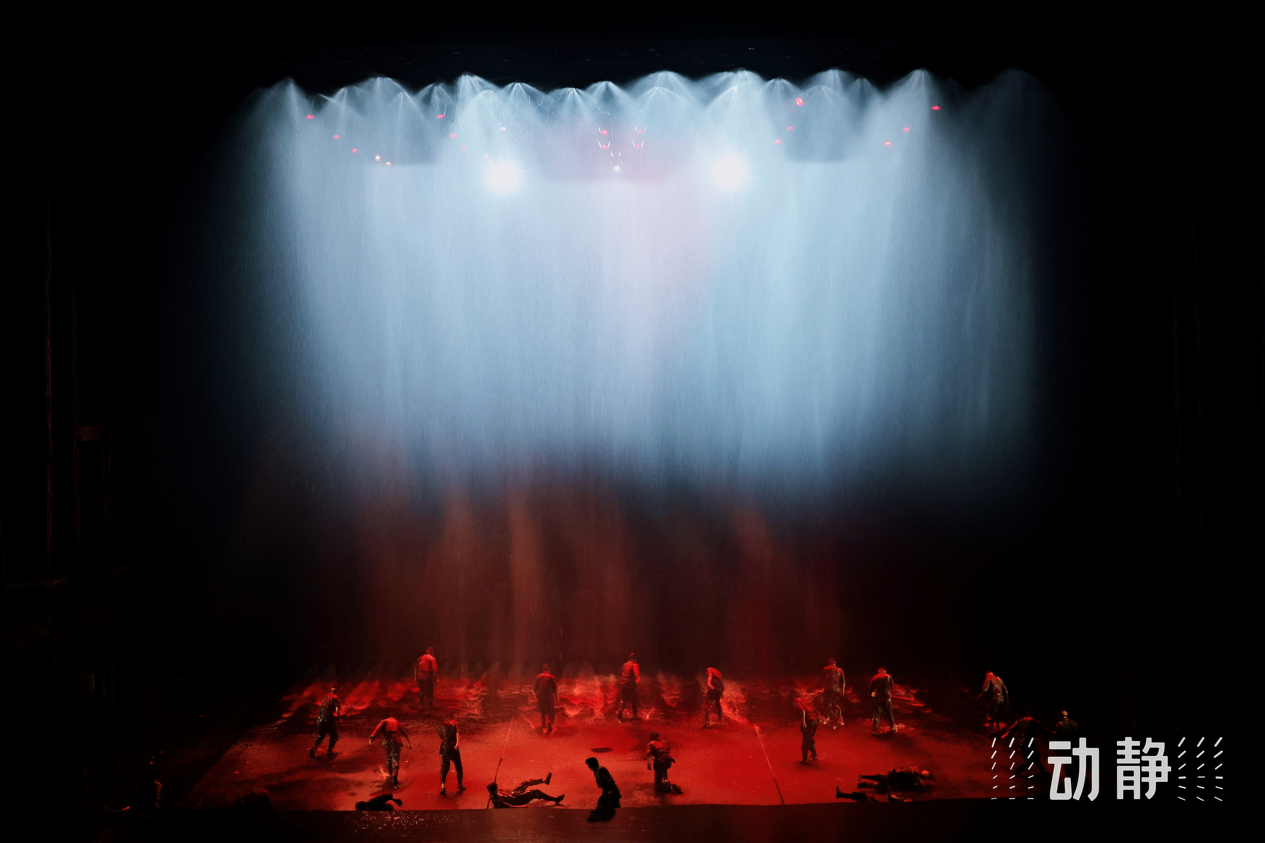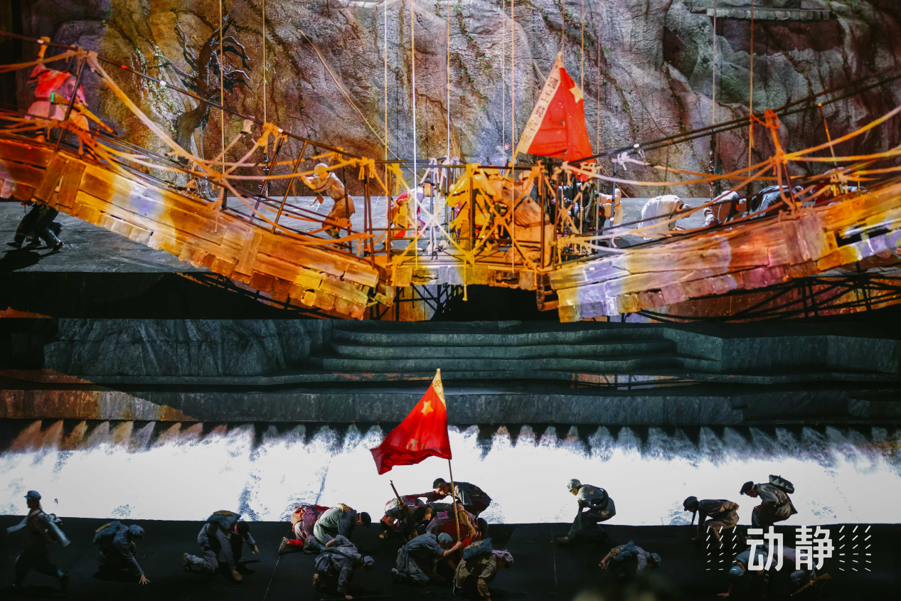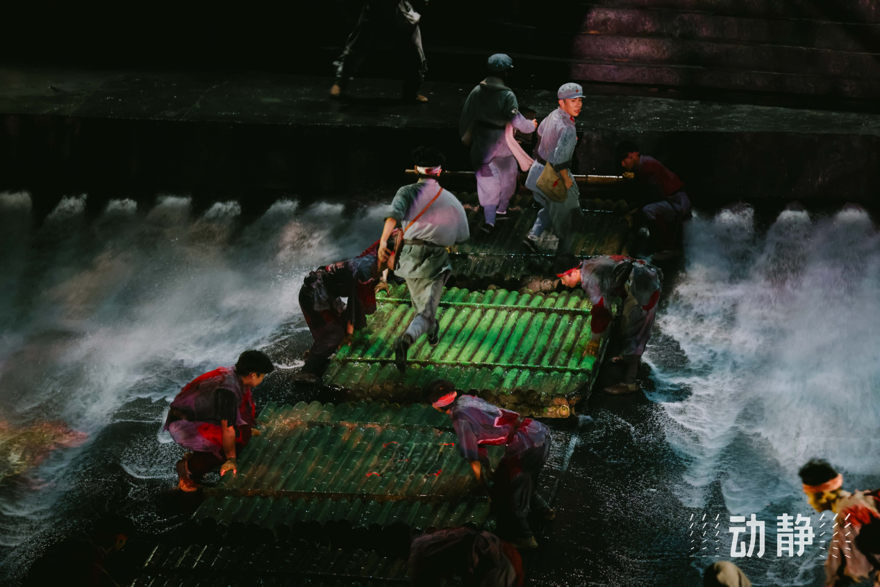 伴随着舞台灯光亮起,数十名“红军”从吊桥冲向“战场”,舞台上方倾斜而下的水柱化作“湘江”,“红军”在炮火轰炸中穿越浮桥……此起彼伏的战争场景,混合着扑面而来的水汽,让现场观众瞬间沉浸到湘江战役的激烈中。