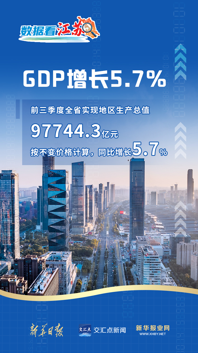 根据江苏省统计局发布数据显示,前三季度全省实现地区生产总值97744.3亿元,按不变价格计算,同比增长5.7%。从整体表现来看,全省经济运行稳中有进,GDP增长5.7%,增速与上半年基本持平。