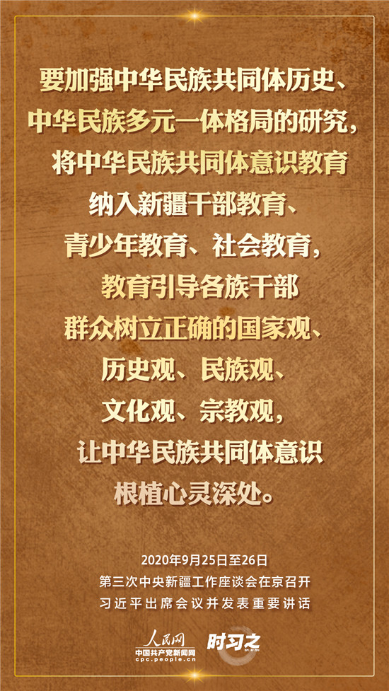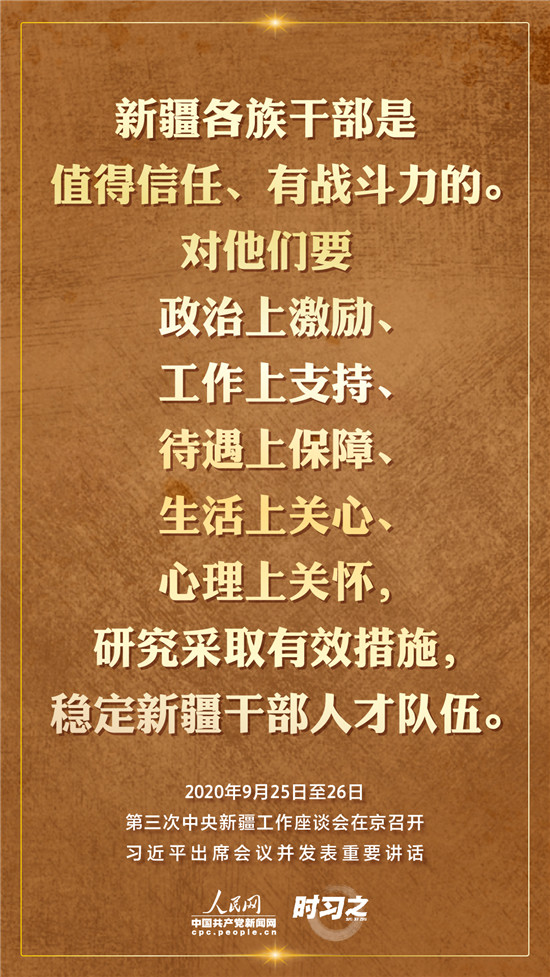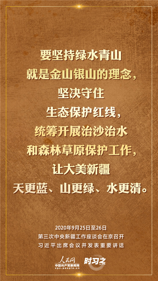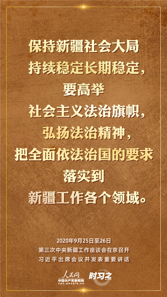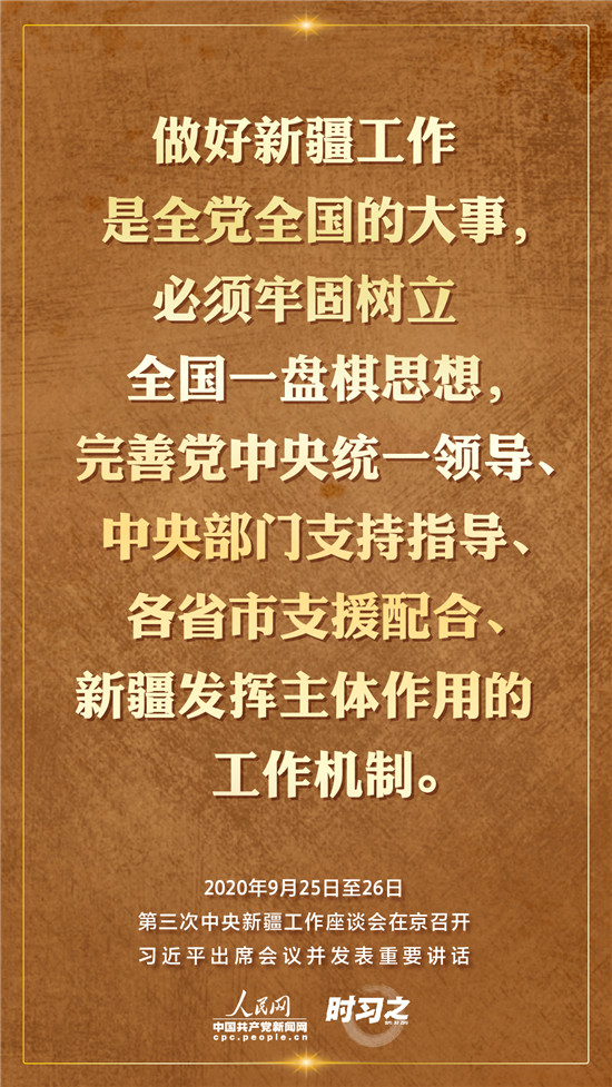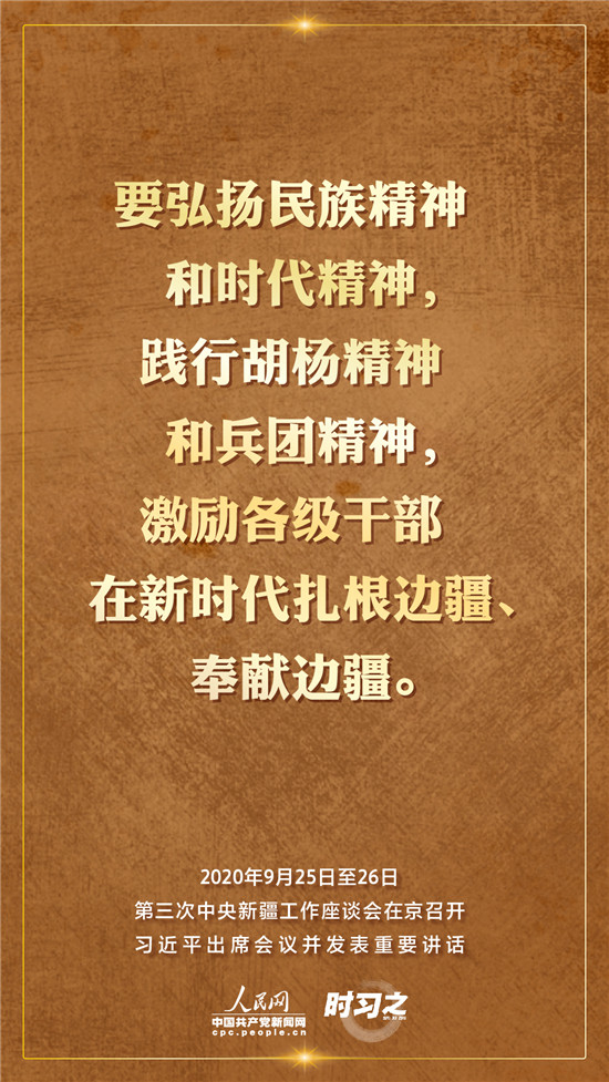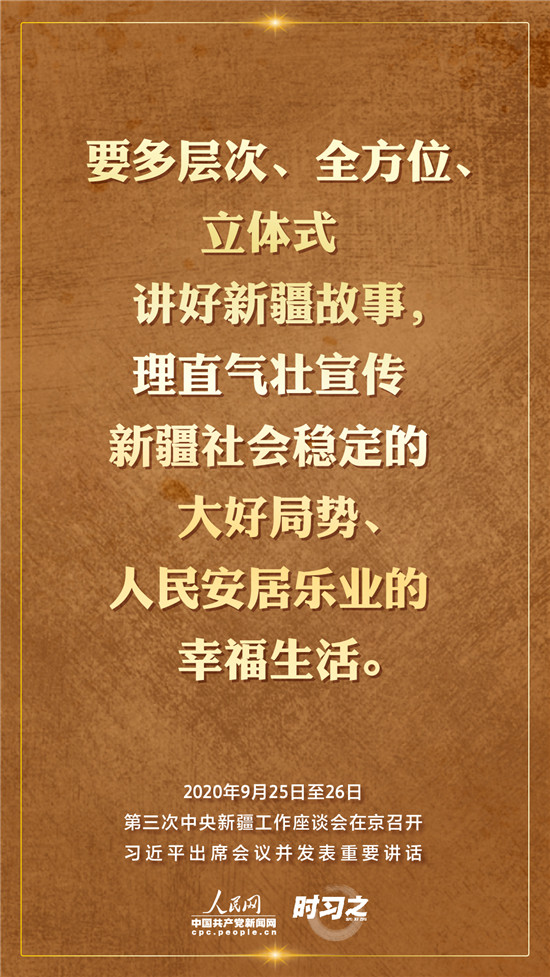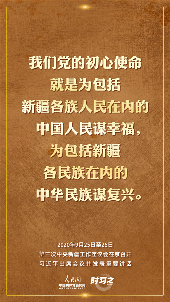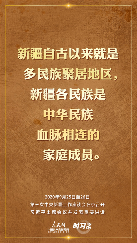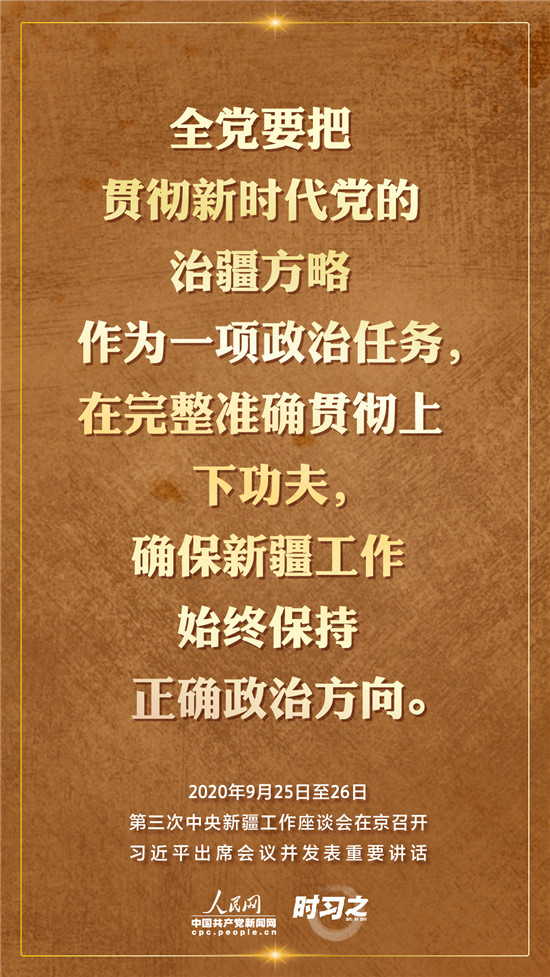 9月25日至26日,第三次中央新疆工作座谈会在北京召开。习近平总书记出席会议并发表重要讲话。习近平全面总结了第二次中央新疆工作座谈会以来新疆工作取得的重大成效,深入分析了当前新疆工作面临的形势,阐释了新时代党的治疆方略,明确了当前和今后一个时期新疆工作的指导思想、目标任务、方针政策、战略举措,全面部署了推动新疆社会稳定和长治久安的重点工作。人民网中国共产党新闻网“时习之”栏目带您聆听总书记那些直抵人心的讲话金句。