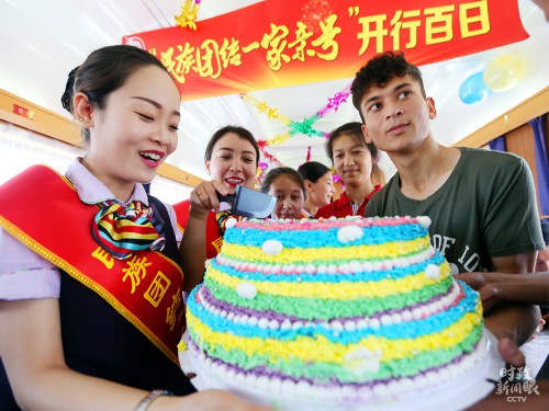 △2017年7月2日,“民族团结一家亲号”特快列车满百日,工作人员当天给旅客送上百日蛋糕。