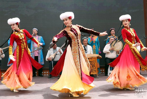 △乌鲁木齐某景区演员表演新疆民族舞蹈。