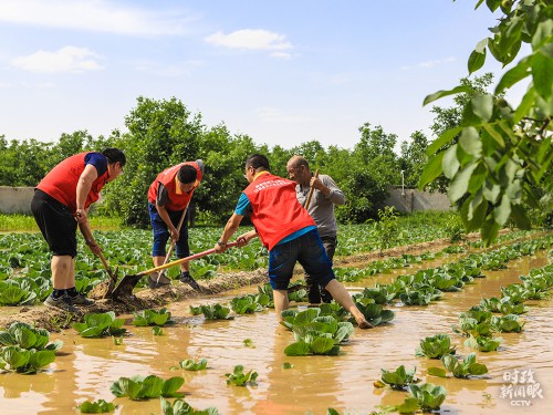 △新疆阿克陶县村民在林果基地为桃树打枝,林间同时套种了西瓜。