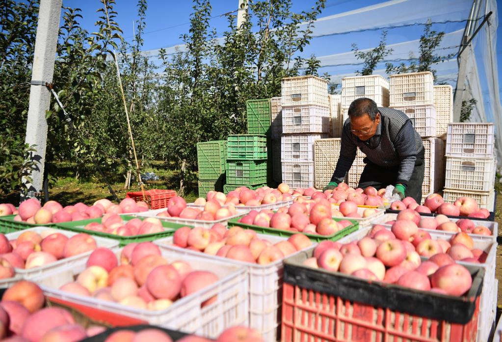 2022年10月10日,果农在延安市洛川县阿寺村一处果园采摘苹果。新华社记者 张博文 摄