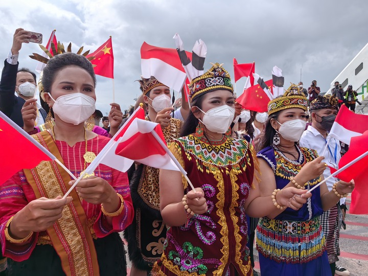 礼兵分列红地毯两侧致敬,身着民族服装的当地青年演奏起印尼传统乐器伽美兰,盛装印尼女青年跳起巴厘岛传统舞蹈“朋德舞”,当地学生挥舞中国和印尼两国国旗,用中文欢呼“欢迎,欢迎!”