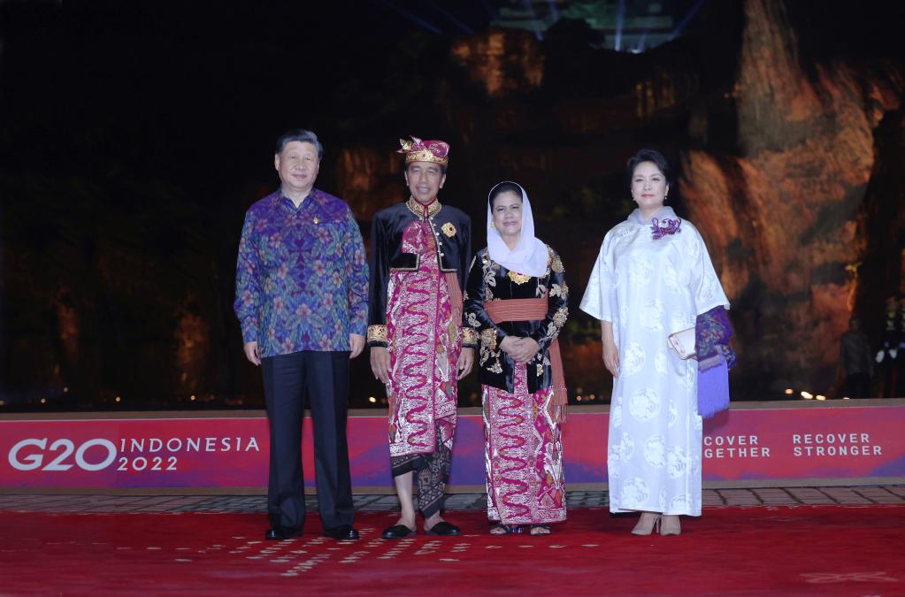 当地时间11月15日晚,习近平和夫人彭丽媛出席佐科总统和夫人伊莉亚娜在巴厘岛神鹰广场举行的二十国集团领导人峰会欢迎晚宴。