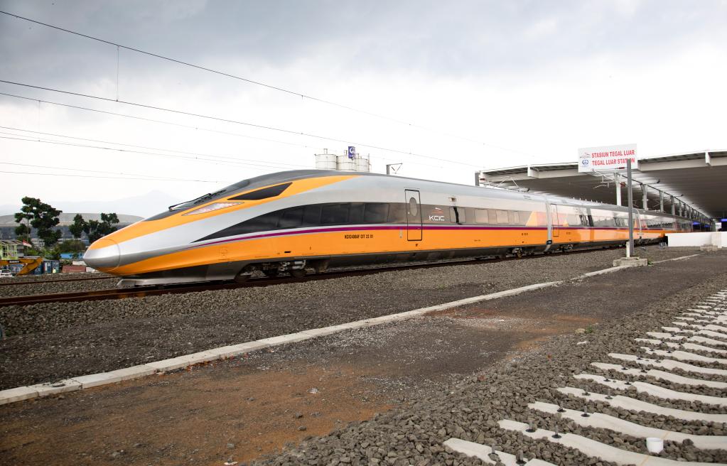11月16日,在印度尼西亚万隆,高速铁路综合检测车行驶在雅万高铁试验段。新华社发(焦宏涛摄)