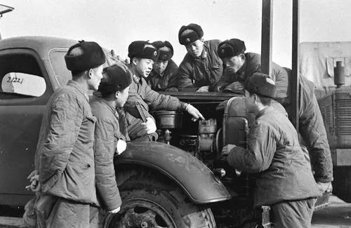 这是雷锋(左三)向战友传授安全行车和节油的经验(资料照片)。新华社发