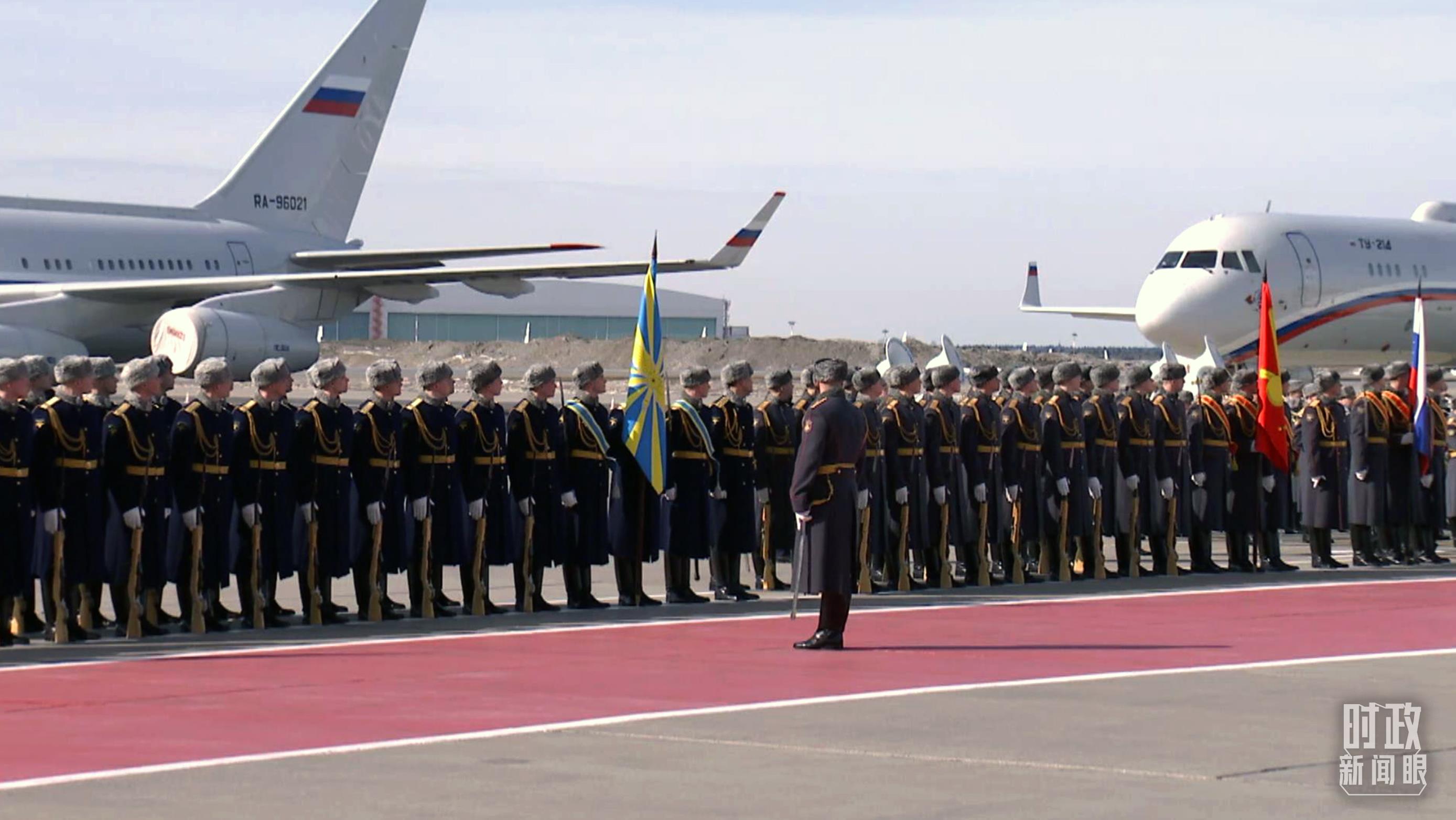 俄方在机场举行隆重迎宾仪式。军乐团奏中俄两国国歌。习主席检阅俄罗斯三军仪仗队并观看分列式。