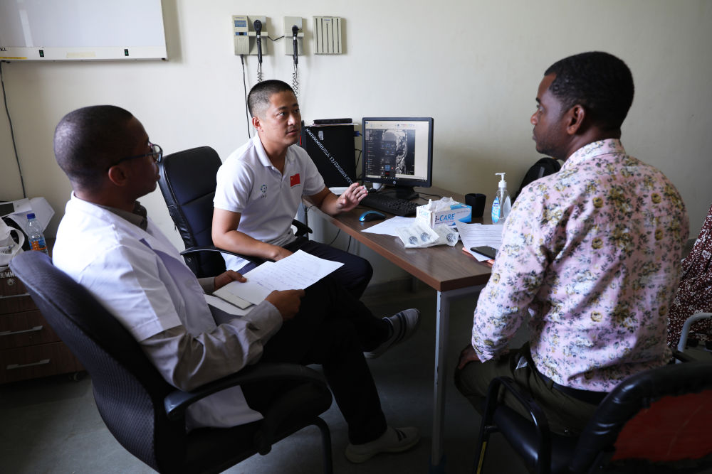 2023年2月22日,在坦桑尼亚桑给巴尔岛纳兹莫加医院,中国援桑给巴尔医疗队成员郭伟(左二)给病人看病。新华社记者 董江辉 摄